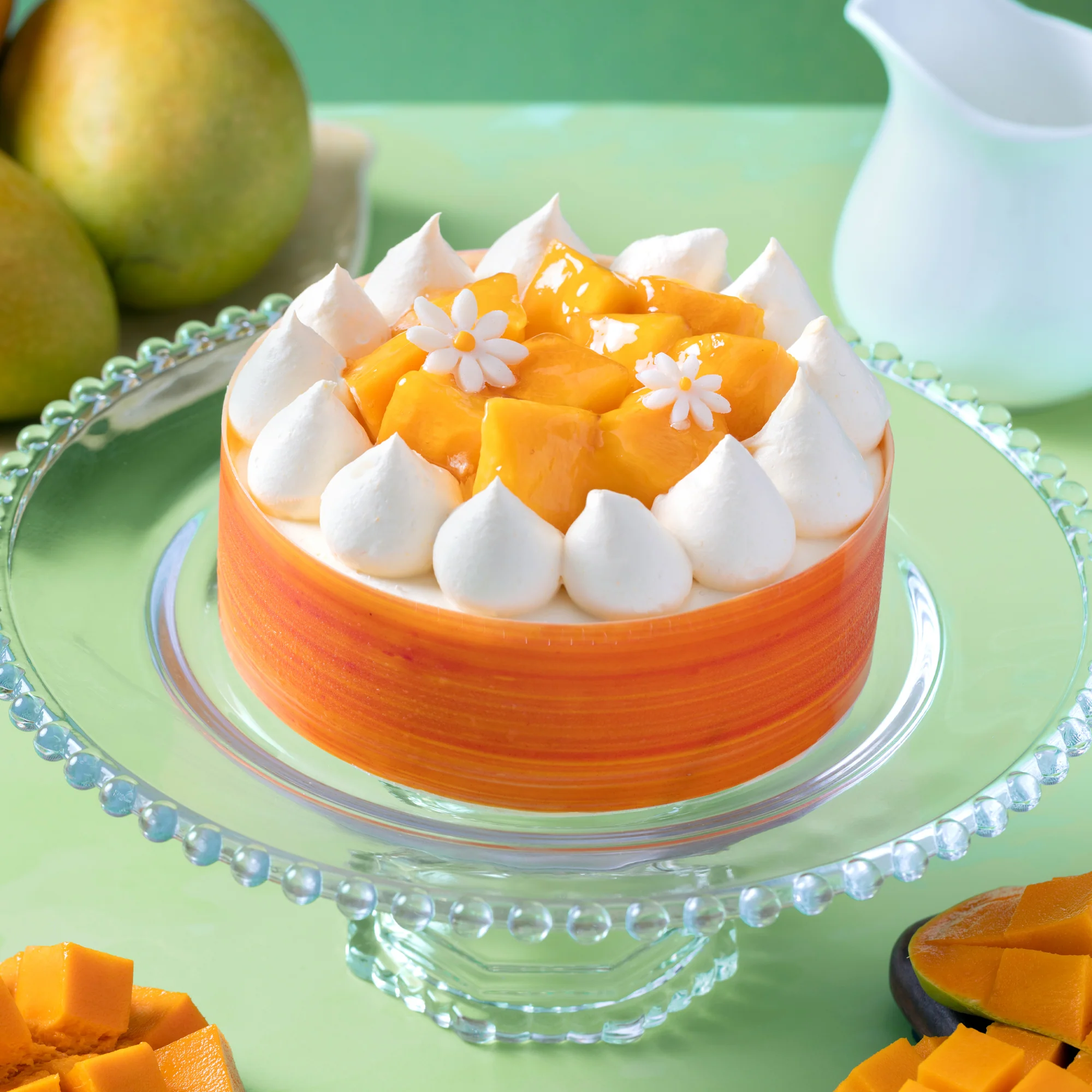 Layers of mango diplomat cream, house-made mango jam and soft vanilla sponge. The cake is finished with whipped cream and garnished with diced fresh mangoes.